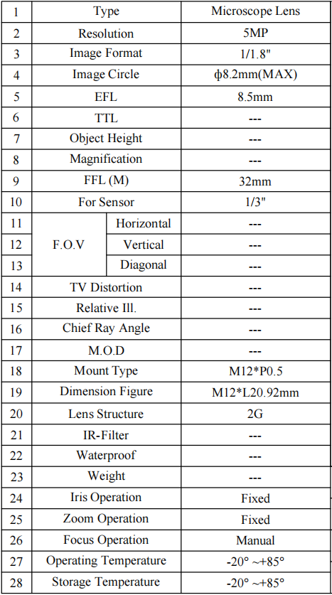 | Model | Sensor Format | Focal Length(mm) | FOV (H*V*D) | TTL(mm) | IR Filter | Aperture | Mount | Unit Price | ||