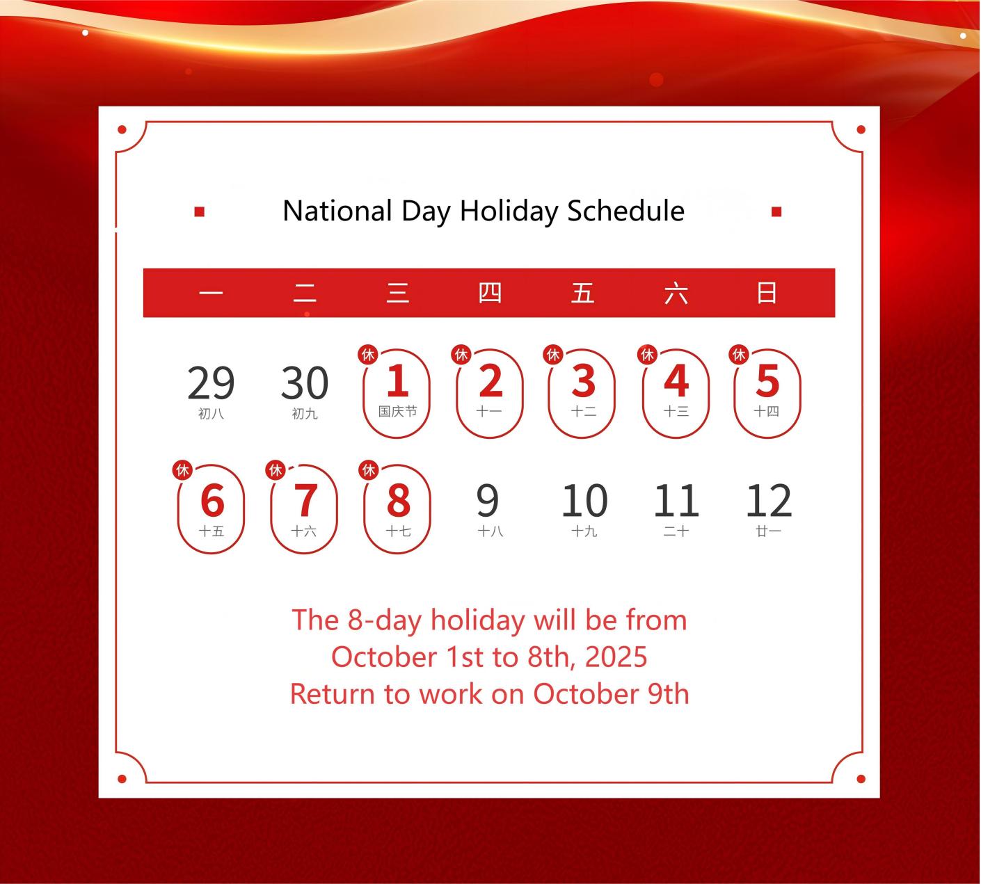 According to the national oliday arrangements, our company will be closed from October 1 (Wednesday) to October 8 (Wednesday), 2025, for a total of 8 days. We will officially resume work on October 9 (Thursday).