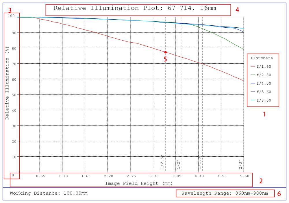 Point 5 in the image: Measured with a 16mm lens at F1.6 aperture in the 860nm-900nm wavelength range, the relative illumination at a half-image height of approximately 3.5mm is about 78% compared to the center.